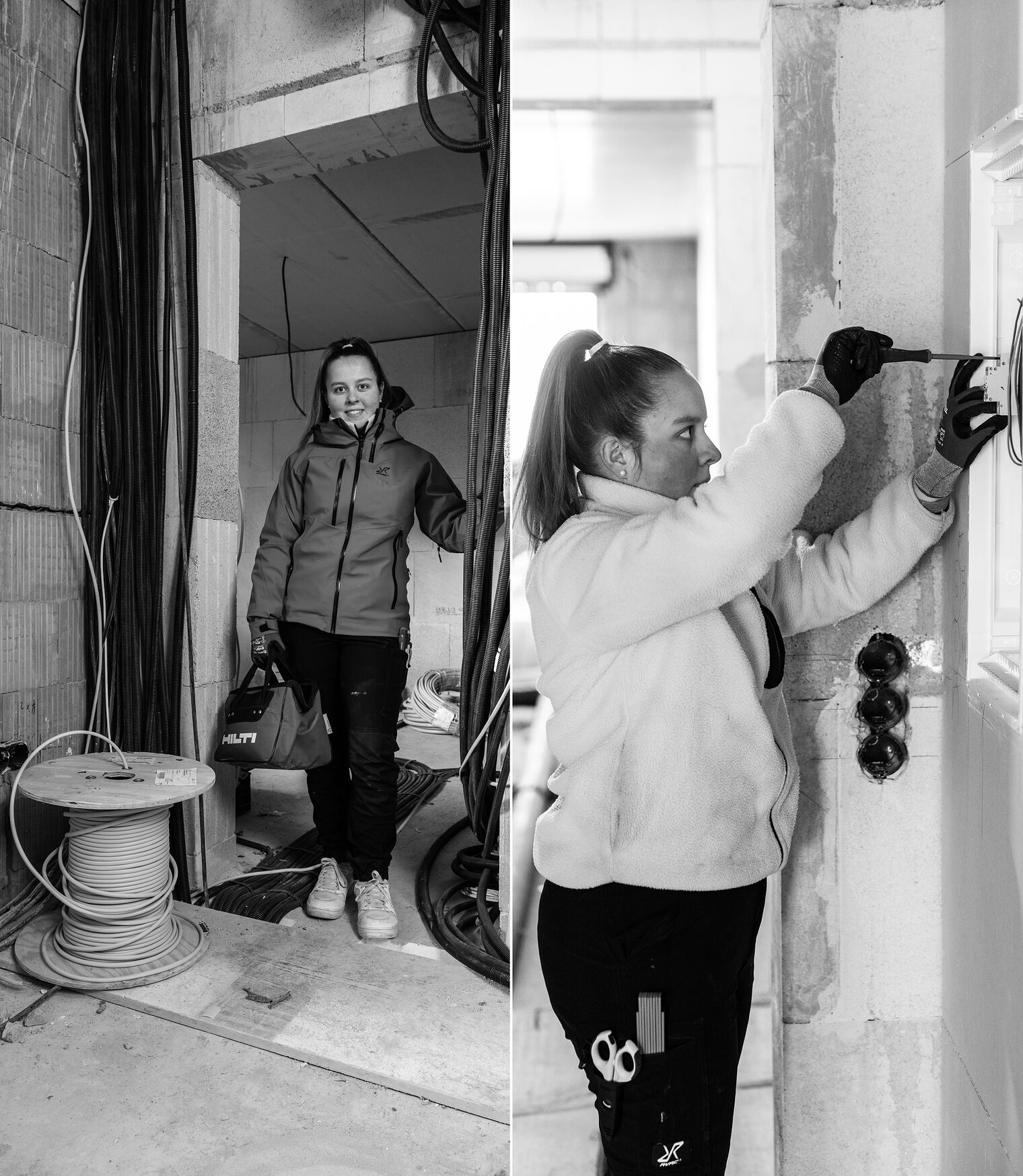 Sarah Jetter, Elektronikerin für Energie- und Gebäudetechnik. Elektrotechnik Stolz, Steinheim. Auf der Baustelle erkennt man sie sofort: ein rosa Akkuschrauber, pinke Schraubenzieher und das passende Oberteil.