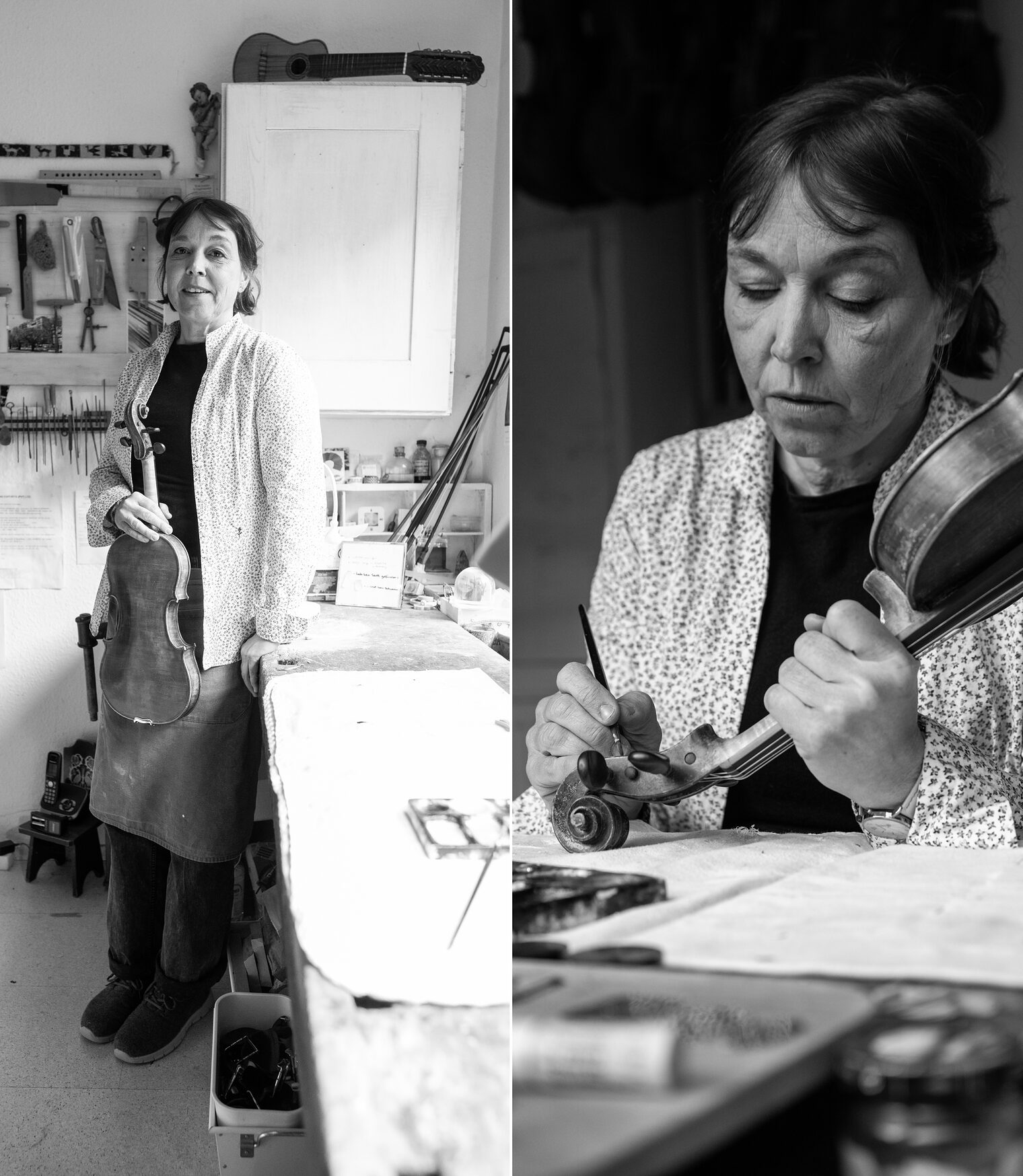Sandra Papakostidis, Geigenbauerin. Werkstatt für Geigenbau, Stuttgart. Mit feinen Schnitzmessern, geschultem Blick und Fingerspitzengefühl arbeitet sie an jedem Detail.